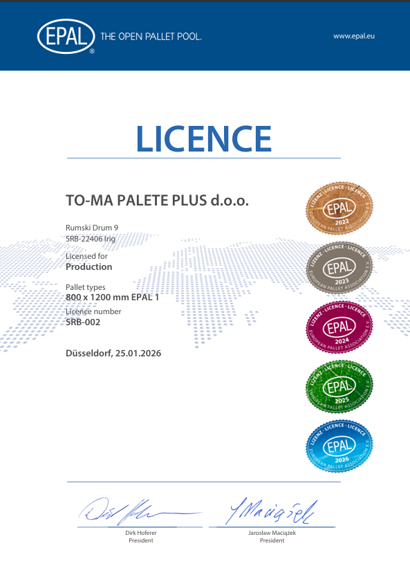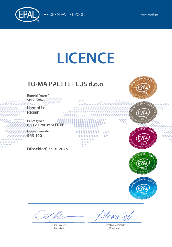 Nosioci smo licence EPAL za proizvodnju i reparaciju paleta.Nosioci smo dozvole za obavljanje poslova toplotnog tretiranja paleta i drugog drvenog materijala za pakovanje.